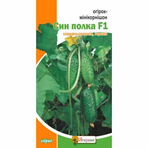 Огірок мінікорнішон Син полку F1 - скоростиглий бджолозапильний гібрид. Термін дозрівання 37-45 днів. Кущ середньорослий, жіночого типу цвітіння, формує пучкову зав'язь, по 4-6 штук. Зеленці надзвичайно смачні, не переростають та не жовтіють. Сорт генетично позбавлений гіркоти, толерантний до хвороб баштанних культур і дуже пластичний до умов вирощування. Його можна культивувати і на грядках, і в теплиці, отримуючи до 10 кг плодів із 1 кв. метра