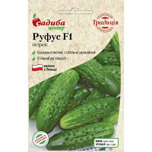 Огірок Руфус F1 - стабільно врожайний салатний і засолювальний гібрид. Сорт середньостиглий, стійкий до основних хвороб огірків. Зеленці дуже красиві, насичено-зелені, з великими горбками. Відрізняються високою якістю: ніколи не гірчать, без пустот і не жовтіють.