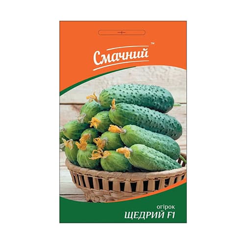 Огірок Щедрий F1 - середньоранній гібрид самозапильних огірків. Термін дозрівання 46-52 дні. Висаджувати потрібно у відкритому ґрунті. Пагони мають довжину приблизно 2,5 м по 2-3 плоди на одному вузлі. Період плодоношення до 2 місяців. Огірочки не великі, 11-13 см і вагою від 100 до 130 г. Плоди можуть використовуватися в солінні та консервації. Також їх можна вживати у свіжому вигляді.