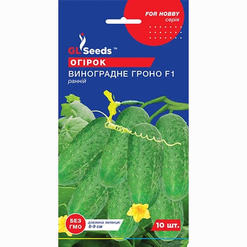 Огірок Виноградне гроно - ранньостиглий бджолозапильний гібрид з пучковим плодоутворенням. Термін дозрівання 45-50 днів. Корнішони завдовжки 8-9 см, горбкуваті, ароматні, хрусткі, без пустот, відмінного смаку, не гірчать і не жовтіють, у засолюванні не втрачають забарвлення, залишаються щільними. Стійкий до несправжньої борошнистої роси, вірусу огіркової мозаїки та парші гарбузових культур.