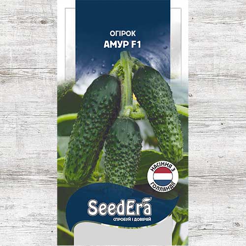 Огірок Амур - надзвичайно ранній гібрид, термін від появи ростків до першого урожаю становить 40-45 днів. Кущ міцний, з м'ясистим розлогим гіллям, прекрасно регенерує, стійкий до несприятливих умов. В одному вузлі формується від 8 до 10 плодів, покритих густими шипами, циліндричної форми, рівномірного темно-зеленого забарвлення, не схильних жовтіти. М'ясиста м'якоть плодів не гірчить, має чудові смакові властивості, тонку шкірку і невелику насіннєву камеру. Ідеально підходить для виробництва пікулів завдяки однорідному розміру плодів. Огірок Амур невибагливий, стійкий до несприятливих умов, таких як спека і засуха, захворювань і шкідників.