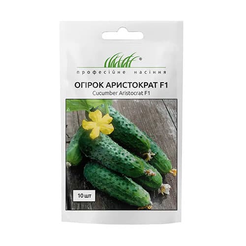 Огірок Аристократ F1 – сорт-корнішон партенокарпічного типу, з раннім терміном дозрівання (від 35 днів). Огірки темно-зелені зі світлими смугами та шипами, злегка звужуються донизу, щільні. У пазухах листків формується 2-3 плоди. Рекомендується для засолювання та салатів, на смак хрусткі, без гіркоти.