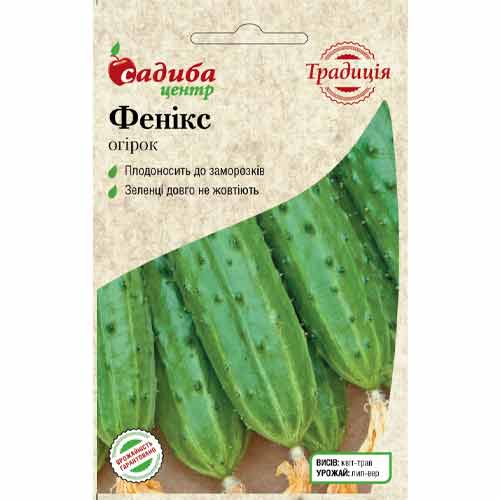 Огірок Фенікс – пізньостиглий сорт, який дозріває за 55-65 днів. Він відноситься до комахозапильних, вирощувати його варто у відкритому ґрунті. Врожаї високі та якісні. Довжина зеленців 16 см, вони крупнобугристі, хрусткі та соковиті. М'якоть без гіркоти, шкірка із невеличкими білими шипами. Завдяки відмінним смаковим якостям сорт можна вживати в свіжому вигляді, консервувати, засолювати та маринувати.
