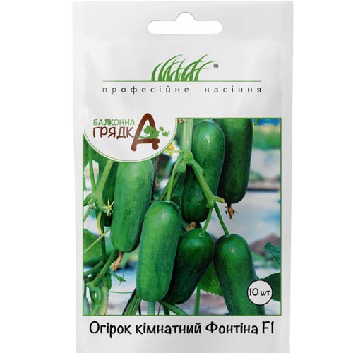 Огірок кімнатний Фонтіна подарує перші плоди вже через 30 днів після посадки. Діаметр огірочків досягає не більше 3-4 см, а довжина – 10-12 см. Відмінна риса сорту – відсутність пухирців на тонкій шкірці. Крім того, шкірка не гірчить, а м'якоть запам'ятається своєю солодкістю. Плоди підходять і для нарізування в салати, і для консервування.