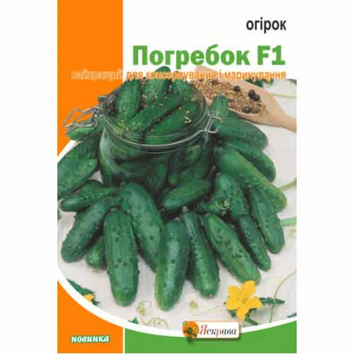 Огірок Погребок F1 – скоростиглий (45-48 днів) гібрид для засолювання. Відрізняється високою врожайністю – до 15 кг/кв. м. Плоди товсті, з великими горбками, соковиті, масою 110-120 г. Можна консервувати і в фазі корнішонів.