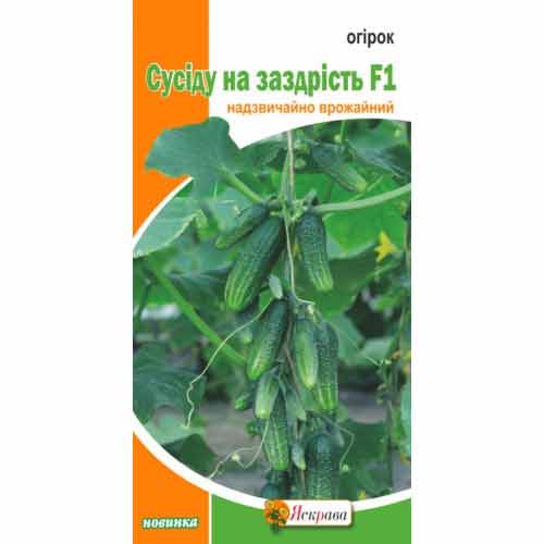Огірок Сусідові на заздрість F1 – ранньостиглий гібрид жіночого типу цвітіння. Плоди з великими горбками мають рівномірне темно-зелене забарвлення, характерна подовжена форма, розмір – 10-12 см. На смак – без гіркоти, в засолюванні виходять ніжними, з хрумтінням. Сорт середньої врожайності. Вага зеленця в середньому – 120 г.