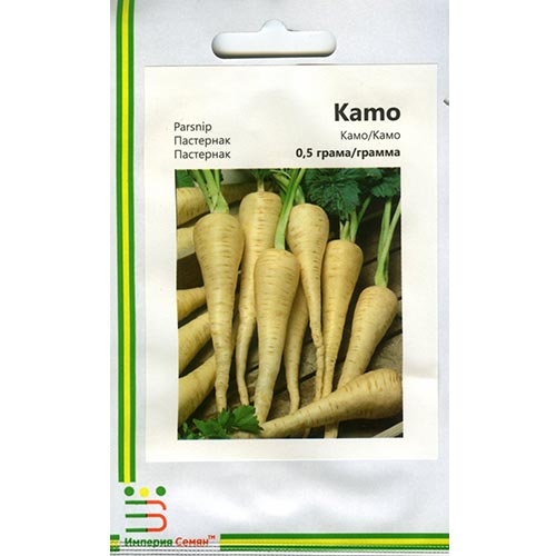 Пастернак Камо – вид є високоврожайним. Коренеплід має конусну форму, довжиною 20-25 см, жовто-білого кольору, високо ароматний. Можливий ріст у важкому грунті.Стійкий до морозу, може залишатися в землі взимку, довго зберігається. Універсальний у плані вживання та переробки.