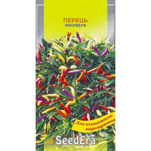 Перець декоративний Феєрверк – це компактний розгалужений чагарник, кімнатна плодово-декоративна культура. Стебла висотою 40 см, обнизані смарагдовими щільними листями і безліччю яскравих різнокольорових плодів. На кущику одночасно висять жовті, червоні, малинові та пурпурно-чорні стручки. Плоди придатні для використання в кулінарії.