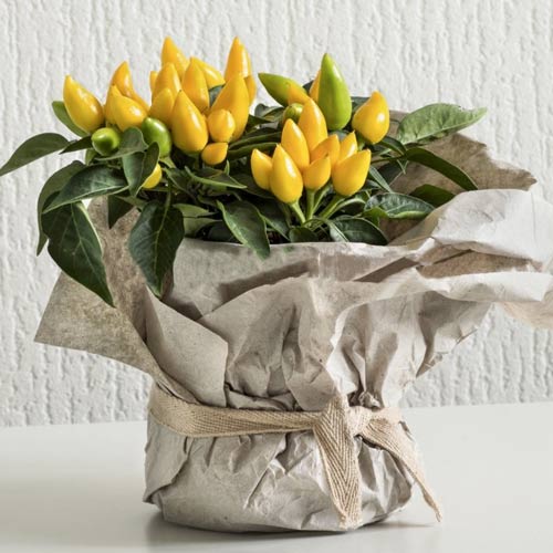 Перець декоративний Голд Фінгер має букетне розташування плодів: перчики стирчать вгору. При цьому яскраво-жовте забарвлення надає схожості з тюльпанами. Стінки у плодів тонкі – 2-3 мм. Маса досягає 4-5 г. В інтернет-магазині «GradinaMax» ви зможете придбати насіння перцю декоративного, який додасть пікантності літнім салатам завдяки своїй гостроті. Сорт добре підходить для приготування приправ до м'ясних страв.