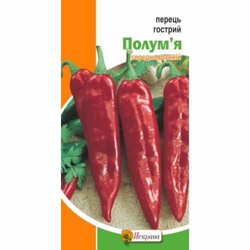 Перець гострий Полум'я – середньоранній сорт з видовженими конусоподібними плодами, які мають гладеньку поверхню і червоне забарвлення. Маса становить приблизно 50-70 грам. Відрізняється особливим ароматом, м'яким і вкрай гострим м'якушем. Плоди багаті цінними вітамінами (С, Р, В1, В2) і каротином. Основна сфера застосування – соління та консервація, а також приготування соусів і маринадів.