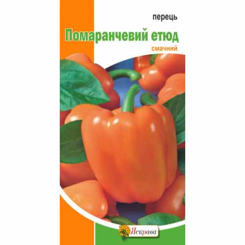Перець Помаранчевий Етюд - стане родзинкою вашого городу. Кущ високий, заввишки до 100 см, плоди у вигляді куба, максимальна маса 250 г. Переможець за вмістом бета-каротину і вітаміну С, а також багатий іншими корисними речовинами. Усе джерело корисних речовин доповнює низька калорійність овоча. Солодкі плоди помаранчевого відтінку створять сонячний настрій на грядці та на столі.