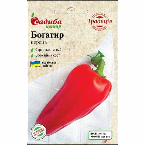 Перець солодкий Богатир – сорт, плоди якого відрізняються дійсно значними розмірами, їх довжина досягає 18 см. Через 120-160 днів ви отримаєте рясний урожай яскраво-червоних перчиків масою до 200 г, які стануть прекрасною сольною закускою або ж приправою до будь-якої консервації.