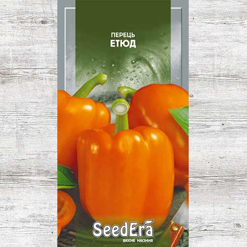Перець солодкий Етюд - середньоранній, універсальний в вирощуванні, успішно приносить високі врожаї в теплицях та на відкритому ґрунті. Стійкий до захворювань та несприятливих умов. Плоди довжиною 7-9 см та вагою 150-200 г мають злегка ребристу поверхню і темно-оранжеве забарвлення, солодку соковиту м’якоть. Підходять для вживання у свіжому вигляді, приготування страв та консервації.