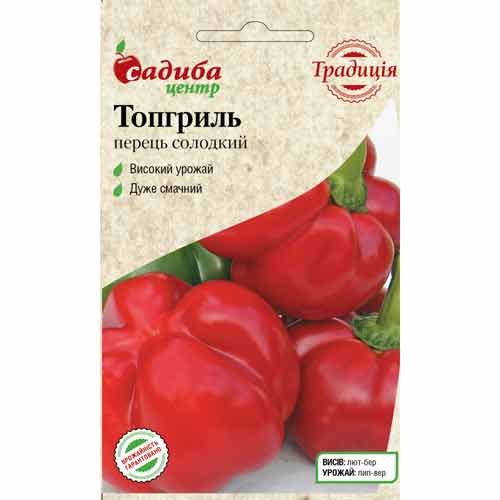 Перець солодкий Топгриль – високоврожайний сорт із раннім терміном дозрівання. Його можна вирощувати у теплицях та пластикових тунелях. Плоди кулясті, томатоподібні, невеликі (8-12 см). Їх маса сягає 70-80 г, шкірка забарвлена в яскраво-червоний колір, м’якоть має чудовий смак та аромат. Сорт вважається одним з найкращих для приготування вітамінних салатів та консервування.