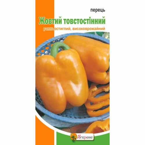 Перець солодкий Жовтий Товстостінний - один із найсмачніших сортів. Кущ високий, висотою до 95 см, плоди кубічної форми, чотирикамерні, вагою до 110 г. Плоди яскравого відтінку дозрівають рано, мають відмінний смак, а за вмістом вітаміну С і бета-каротину посідає перше місце серед інших овочів. Вирощувати його легко, це досить невибаглива рослина з високим показником урожайності.
