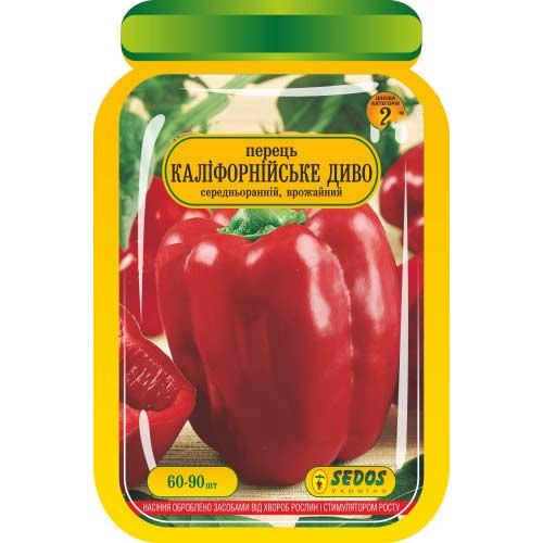 Перець солодкий Каліфорнійське Диво червоне - великі перці цього сорту з яскраво-червоним забарвленням і насиченим смаком використовують у салатах і закусках, фарширують, додають до других страв, а також до м'яса і риби. Сорт середньостиглий, період дозрівання 120-130 днів, кущі виростають на 50-70 см, плоди соковиті з товстими стінками. Крім відмінних смакових характеристик перець містить безліч вітамінів, він лідер серед овочів за кількістю вітаміну С.