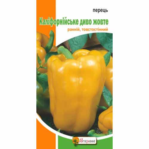 Перець солодкий Каліфорнійське Диво жовте - посідає провідне місце серед городників. Кущ високий, близько 70 см, плоди жовті з максимальною вагою 160 г, мають чотиригранну ребристість, м'якоть дуже соковита, стінки товщиною понад 6 мм. Перевага в невимогливості догляду, великій кількості врожаю яскравих і соковитих плодів продовжує підкорювати серця професіоналів і новачків. Важливу роль у виборі цього сорту відіграє наявність корисних речовин у плодах і універсальність його застосування в кулінарії.