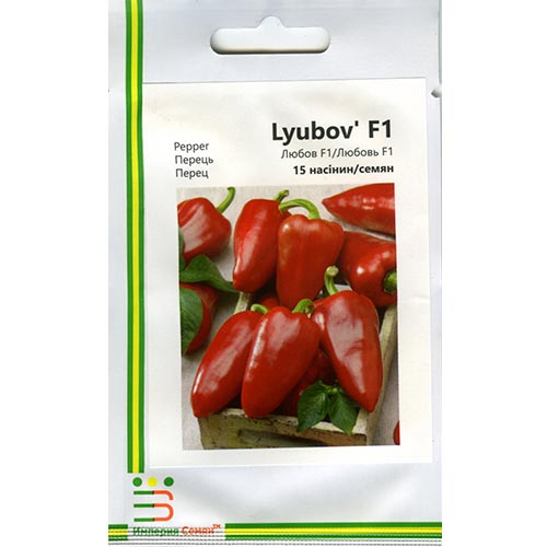 Перець солодкий Любов F1 - середньостиглий гібрид солодкого перцю. Призначений для вирощування у відкритому ґрунті. Відмінний вибір для переробної промисловості та заморозки. Колір плоду в технічній стиглості – зелений, а в біологічній – насичено-червоний з восковим нальотом. Стійкий до стресових умов вирощування, а також до вірусу тютюнової мозаїки.Відмінна лежкість та транспортабельність.