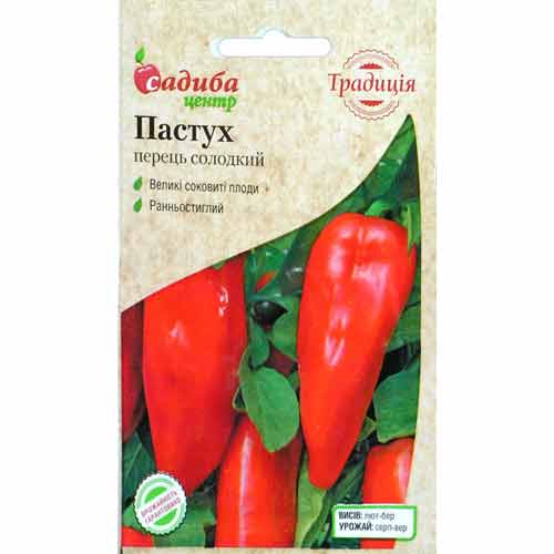 Перець солодкий Пастух - оригінальний ранній високоврожайний сорт. Кущ невеликий і компактний, висотою 45-65 см, утворює подовжені, до 20 см завдовжки, соковито-червоні, солодкі плоди. Насіння висівають на розсаду в лютому-березні, а у віці 60-80 днів пересаджують у відкритий ґрунт. Чудовий вибір для свіжого споживання, приготування смачних домашніх страв і якісної консервації.