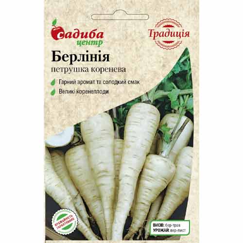 Петрушка коренева Берлінія – популярний сорт із великими (18-22 см) конусоподіними коренеплодами. Вони щільні й ароматні, мають солодко-пряний присмак. Сорт врожайний та стійкий до розтріскування, розгалуження кореня і заморозків. Культуру використовують для свіжого споживання, переробки та у якості приправи.