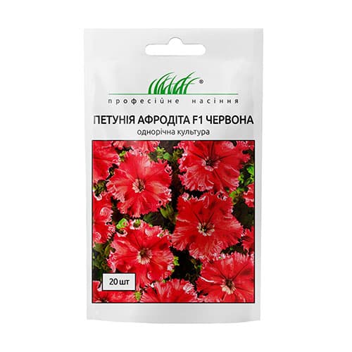 Петунія Афродіта червона F1 - чудовий гібридний сорт петунії з торочкуватими і хвилястими краями. Рослини сильногіллясті, добре і пишноквітучі, висотою до 35 см. Привабливі з яскравими забарвленнями квітки, діаметром 8-9 см. Мають стійкість до несприятливих погодних умов. Насіння на розсаду висівають поверхнево, не присипаючи, в шухлядки, з січня по березень місяць. Зволожують, накривають плівкою або склом, ставлять у добре освітлене місце, створюючи оптимальну температуру для проростання +20 градусів. Перші сходи з'являються на 10-14 день. У фазі 2-х справжніх листочків, розсаду пікірують. На постійне місце пересаджують наприкінці травня. Використовують для посадки в квітники і для підвісного декорування саду.