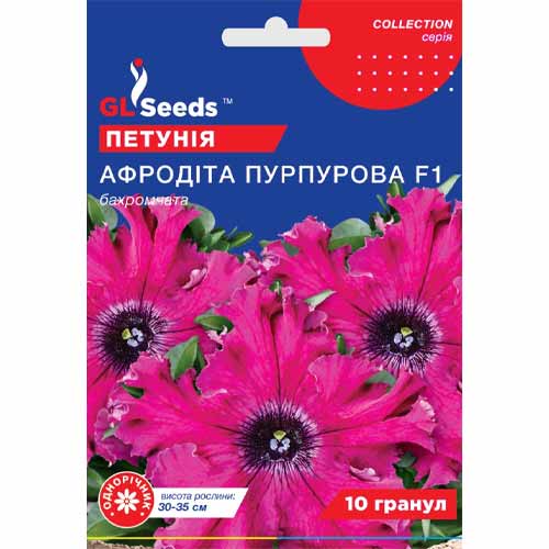 Петунія Афродіта пурпурова F1 - унікальний гібрид чеської селекції! Хвилясто-бахромчасті квітки насиченого відтінку діаметром 8-9 см. Разом виглядають немов пишна мереживна пурпурова хмара. Рослини кущові, гіллясті, висотою до 35 см. Не потребують додаткового формування кущів. Рясне цвітіння триває аж до настання заморозків. Гібрид рекомендується для контейнерної культури і квітників, при вирощуванні у вазонах утворює невеликий каскад. У період цвітіння посадок рекомендується передбачити захист від дощів і сильного вітру. Насіння в гранулах! Гранули розташовують на поверхні ґрунту, не закладаючи їх, добре зволожують з розпилювача. У разі потрапляння вологи на гранулу оболонка має розчинитися. Посіви накривають склом для збереження постійної вологості до повних сходів. Лютневим посівам потрібне додаткове підсвічування.