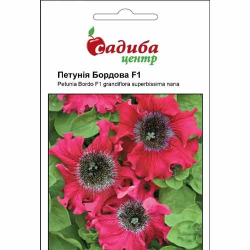 Петунія Бордова F1 – компактний однорічник, на якому формуються просто гігантські бутони. Їх діаметр сягає 16 см, пелюстки забарвлені у глибокий винний відтінок, край – хвилястий. Цвітіння триває з червня до глибокої осені. Квітка чудово виглядає в горщиках та вазонах, але її можна сміливо висаджувати й на клумби.