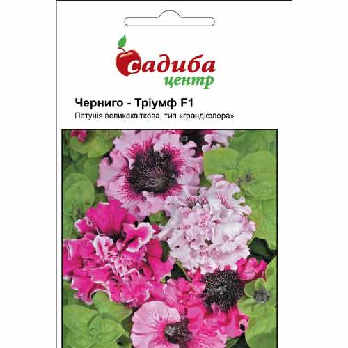 Петунія Черниго Тріумф F1 – гібрид із величезними квітами казкового забарвлення. На пелюстках гармонійно поєднуються білі та фіолетові відтінки, а хвилястий торочкуватий край надає бутонам витонченості. Діаметр цієї краси сягає 16 см. Чагарники міцні, слаборозгалужені, пагони добре витримують вагу квіткових голівок.