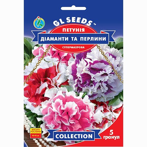 Петунія Діаманти і перлини F1 - блискуча махрова каскадна петунія викликає безперечний захват рясним цвітінням. Гібрид з інтенсивним ростом, густо вкривається квітами, пагони каскадами спадають через краї контейнерів. Квіти кулясті, діаметром 8-10 см, з гофрованими, зубчастими по краю пелюстками. Ідеальна прикраса для балконів, підвісних кошиків і кашпо. Цвітіння з кінця травня до заморозків. Світлолюбна і досить посухостійка. Віддає перевагу легким, родючим, добре дренованим ґрунтам. Вдячно відгукується на полив і регулярні підживлення.