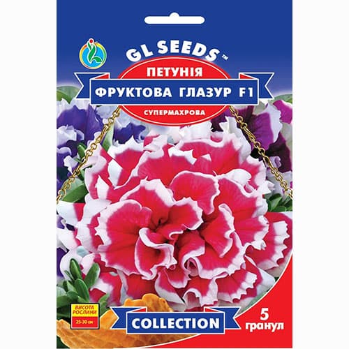 Петунія Фруктова глазур F1 - популярний однорічник. Висота кущика 40 см, з діаметром 12 см. Новий гібрид петунії виділяється ефектними махровими кулястими квітками надзвичайно великих розмірів. Шикарні пухнасті "м'ячики" блищать гамою насичених відтінків, з додаванням білого у вигляді облямівки. Нагадують апетитні тістечка-шедеври, що вийшли з-під руки великих кондитерів. Чудова прикраса для вашого квітника в саду і на балконі, ідеально підходить для контейнерної культури. Посів на розсаду з лютого до середини березня. Чим раніше посіяне насіння, тим раніше настає цвітіння. Лютневим посівам потрібне додаткове підсвічування. Петунія порівняно невибаглива культура, дуже пластична, добре адаптується до будь-яких умов.