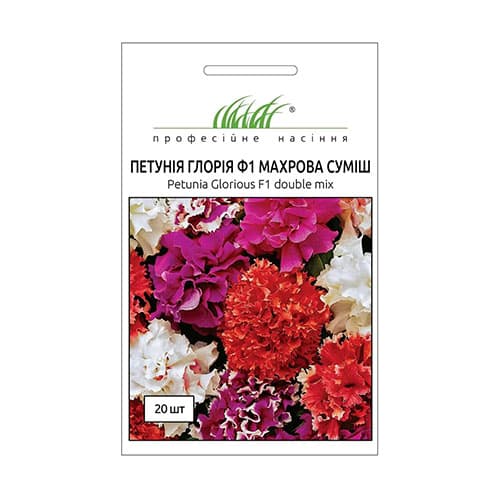 Петунія Глорія махрова F1, суміш забарвлень — сорт петуній з великими махровими квітами. Кущі висотою від 25 до 40 см з хорошим розгалуженням і цілим спектром яскравих кольорів 7-10 см в діаметрі. Пелюстки зі злегка зубчастими краями створюють махрову чарівність. Петунії цього сорту стануть гідною прикрасою будь-якого куточка саду, балкона, Альтанки.