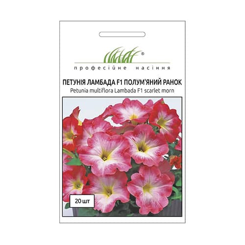 Петунія Ламбада Полум'яний ранок F1 – ефектна однорічна рослина з великими квітами коралового забарвлення. У центрі квітки розташована велика біла пляма – дуже яскраво й ефектно. Рослина часто використовується для декорування садових квітників, садів патіо та балконів. Можна придбати петунію Ламбада Полум'яний ранок F1 для створення ампельних композицій. Сорт – шедевр.