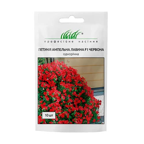Петунія Лавина червона F1 - приваблива каскадна петунія висотою 30-35 см, шириною 60-70 см. Утворює квіти діаметром 5-6 см. Рослина рясно квітуча, стійка до несприятливих кліматичних умов. Петунія цвіте не тільки на кінцях пагонів, а й біля основи, це забезпечує декоративність рослини протягом усього сезону. Вирощують розсадним способом. Використовується для вертикального озеленення та оформлення клумб.