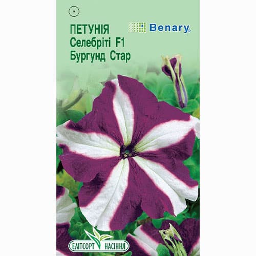 Петунія Селебріті Бургунд Стар - прекрасний гібрид з раннім цвітінням. Рослини компактні, кущисті, добре облиствені, густо вкриті квітами. Діаметр квіток до 8 см. Цвітіння рясне і тривале. Використовують для оформлення клумб, рабаток, в балконних ящиках і контейнерах.