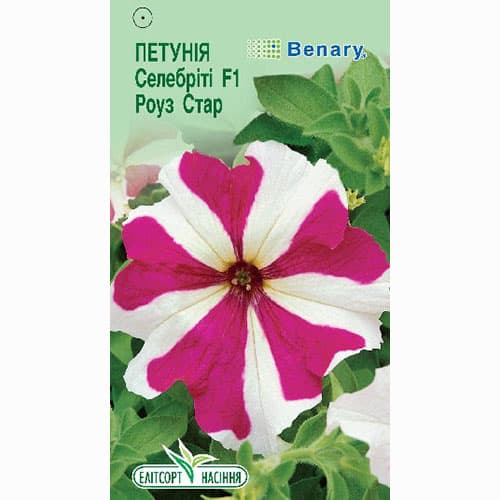 Насіння петунії Селебріті роуз стар - популярна рослина, вирівняна по габітусу, висотою 25-30 см. Одночасно формує кілька квіток з оригінальним забарвленням - рожева зірка на білому тлі. Цвітіння раннє, тривале. Діаметр квітки: 6-8 см. Ідеально підходить для озеленення. Використовують для посадки в горщики, контейнери і відкритий ґрунт.