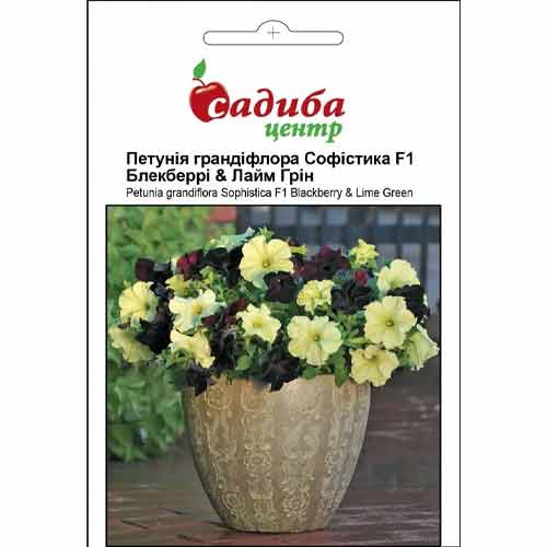 Петунія Софістика F1 – чудовий контрастний дует з бутонами двох відтінків – ніжно-жовтого і темного, кольору нічного піднебіння. Чагарнички пишні, з великою кількістю пагонів, не розвалюються в боки. Їх висота сягає 30-40 см. Купити насіння і виростити петунію Софістіка F1 досить просто – вона невибаглива, не втрачає своєї краси після дощу й вітру.