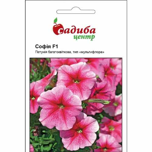 Петунія Софія F1 – багатоквіткова гілляста рослина з витонченими світло-рожевими бутонами, прикрашеними тонкими кармінними прожилками. Діаметр суцвіття – до 9 см. Максимальна висота куща – 40 см. Петунія відноситься до декоративних однорічних рослин і здатна квітнути протягом 3-4 місяців. Квітка світло- та вологолюбна. Використовується для прикраси клумб, бордюрів та горщиків.
