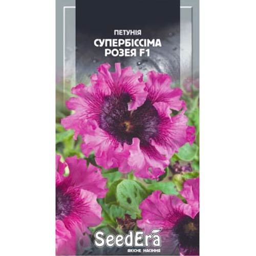 Петунія Супербіссіма Розе F1-гібрид з виключно великими квітками діаметром до 16 см, краю квітки фестончатие. Відтінки від рожевого на пелюстках до майже чорного в середині. Стійка до прохолодної погоди.