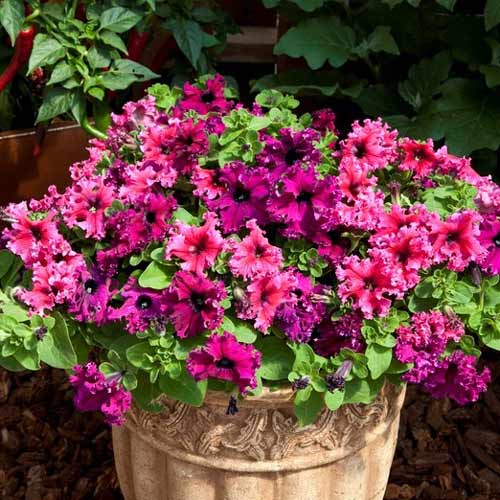 Петунія бахрімчата, суміш забарвлень – чарівні однорічні квіти з торочкуватими берегами. У наборі насіння зібрані квіти різних забарвлень – від рожевого до темно-пурпурового відтінку. Рослину рекомендується вирощувати в вазах, підвісних ящиках і кашпо, у квітниках з однорічними культурами й у саду ароматів. Неймовірно ефектні квіти петунії мають чудовий аромат, пахощі посилюються у нічний час.