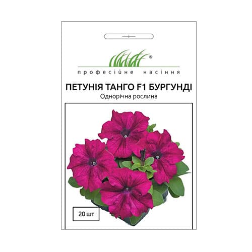 Петунія Танго бургунді F1 – чудовий гібрид насиченого рожево-червоного відтінку. Бутони великі, близько 8 см в діаметрі. Самі кущики средньорослі до 40 см заввишки, неправильної кулястої форми. На культурі одночасно розпускається багато бутонів, а цвітіння продовжується з травня по жовтень. Ці якості роблять петунію бажаною гостею клумб та балконних горщиків.
