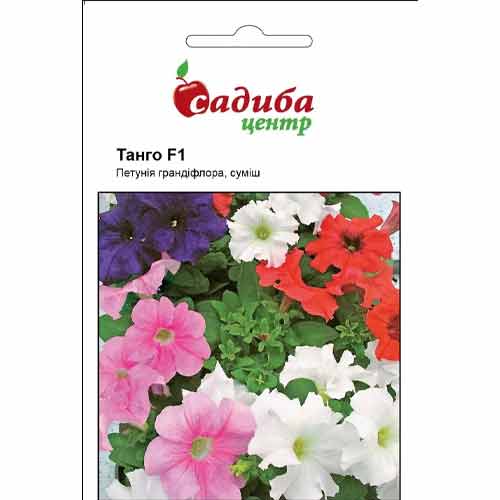 Петунія Танго F1 – ціла суміш гібридів грандіфлора. Вони формують компактні чагарнички, що швидко зростають та не потребують прищипування й регуляторів росту. На клумбах вони витягуються до 25-35 см, а у горщиках – лише до 15-20 см. Діаметр рослини складає 25-30 см. Квіти великі, витончені, із хвилястим краєм. Розпускаються до самих заморозків.
