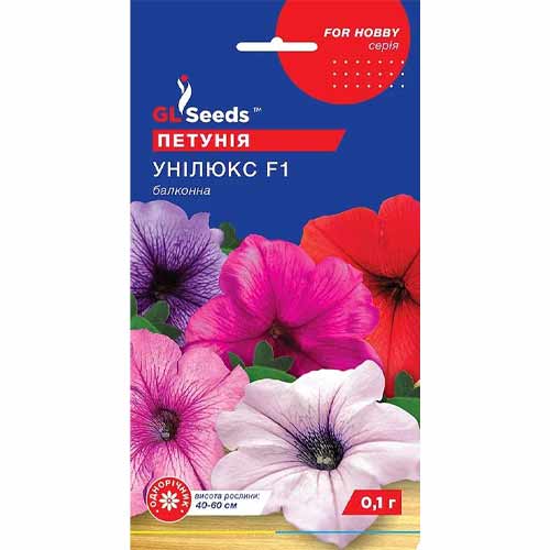 Петунія Унілюкс F1 - суміш сортів з подовженими, напівзвивистими стеблами. Звисаючі пагони не ламаються від поривів вітру. Квіти різноманітного забарвлення. Форма краю пелюсток гладка, хвиляста, торочкувата. Холодостійкі та посухостійкі рослини. Використовуються в підвісних кошиках, вазах, балконних ящиках і створенні яскравих груп на клумбах.