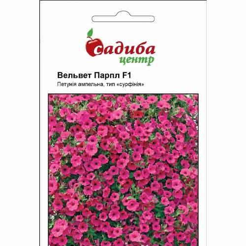 Петунія Вельвет Парпл F1 – чарівна каскадна культура із пагонами довжиною до 1 м. Бутони густо-фіолетові, з темною серцевинкою, діаметром близько 6 см. Розпускаються з початку літа до глибокої осені. Кущі не припиняють розвиток навіть у холодну дощову погоду. Рослини бажано сіяти скрізь, де буде помітний їх каскадний характер – у підвісних кашпо, балконних ящиках та для оформленні «квіткових дерев».