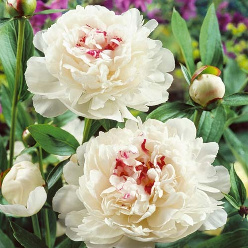 Півонія Фестива Максима - красивий сорт півонії з вражаючими білими суцвіттями. Квітки густо наповнені ніжними пелюстками, білими зовні і червонувато-рожевими всередині кожної квітки. Листя велике, перисте, темно-зеленого кольору. Півонія Фестива Максима буде прекрасною як у ґрунті, так і в горщиках. Вона легко внесе багато природної краси в будь-який простір домашнього саду, а також на балкон або терасу. Квіти придатні для зрізання і створення з них букетів і композицій.