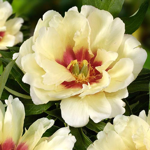 Півонія (Іто-гібрид) Келліс Меморі (Paeonia ITOH Callies Memory) – чудовий нащадок деревовидних та трав'янистих культур. Висота рослини дорівнює 80-90 см. Бутони напівмахрові з відкритою серединкою і ніжним приємним ароматом. Пелюстки кремово-жовті з темним бордовим центром. Квіти великі, їх діаметр дорівнює 15-20 см. Цвітіння починається в травні, триває понад 5 тижнів. Півонії можна розміщувати окремо або невеликими групами посеред газону. Вони добре стоять у вазах.