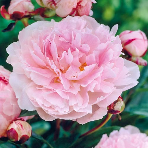 Півонія Тафф - сорт з пишними і ніжними рожевими квітками напівмахрового типу. Суцвіття махрові, їх діаметр 17-18 сантиметрів, всі пелюстки увігнуті всередину, вони чарівно виглядають на тлі ажурного листя. Сам кущ міцний, компактний, висота 70-90 сантиметрів. Квітка видає чудовий приємний аромат.
