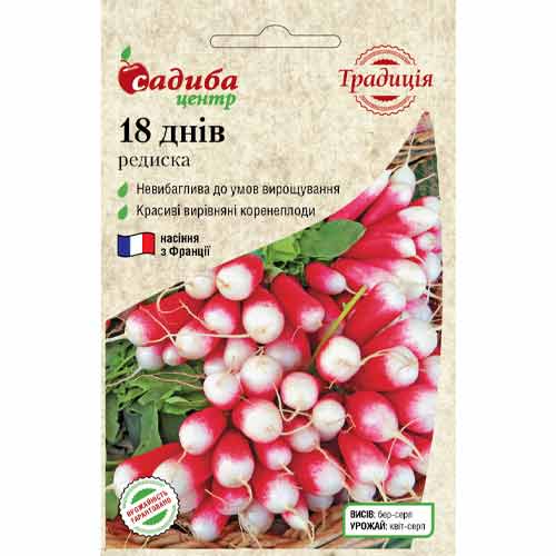 Редис 18 днів - скоростиглий сорт. Вегетаційний період від сходів до технічної стиглості становить 18 - 20 днів. Плоди мають циліндричну форму, рожевого кольору, довжиною 8 - 9 см, масою 25 - 30 г, з білим кінчиком. М'якоть біла, соковита, ніжна, без гіркоти, слабо гострого смаку. Сорт схильний до раннього випускання насіннєвих паростків.