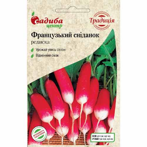 Редис Французький сніданок - ранньостиглий гібридний сорт, який цінується за прекрасні смакові якості і привабливий зовнішній вигляд. Період дозрівання коренеплодів (з моменту сходів насіння до збирання) становить 20 - 23 дні. Форма коренеплоду циліндрична 3 - 4 см в діаметрі, вага 15 - 20 г. Коренеплоди пофарбовані в яскраво-червоний колір з білим кінчиком, м'якоть соковита, біла, без пустот. Віддає перевагу родючому і зволоженому ґрунтові. Редис використовують для приготування вітамінних, свіжих салатів, закусок, бутербродів і домашньої косметики. Ви можете замовити в нашому інтернет-магазині насіння редиски без передоплати.