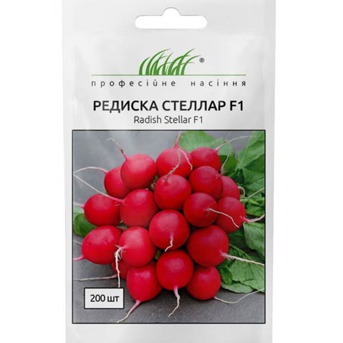 Редис Стеллар F1 — урожайний гібрид, що дає більше 2 кг з квадратного метра практично на будь-яких садових ґрунтах. Коренеплоди з червоною шкіркою і білою м’якоттю, смачні, соковиті і хрусткі, визрівають протягом 23 діб. Стануть ідеальним доповненням до свіжих салатів впродовж усього літнього сезону. Перший посів насіння можливий вже в квітні, наступні - до серпня включно. Сходи після проростання потребують проріджування, оскільки в загущених посадках рослини не формують коренеплід і швидко йдуть в стрілку.