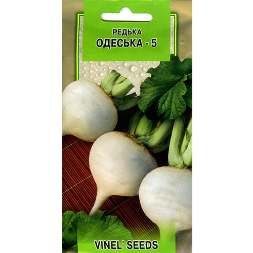 Редька літня Одеська 5 – швидкостиглий сорт. Період від сходів до стиглості 35-45 днів. Коренеплоди невеликі, округлої форми, діаметром 8-9см, масою 50-80г, білого забарвлення. М'якуш білий. Без ГМО.